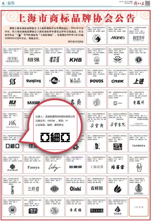 根据上海市商标品牌协会《上海好商标评定管理办法》,历经近八个月的严格筛选与评定,「亚细亚」商标已经通过公示期正式获评「上海好商标」,该项评选结果于2021年12月8日,在《解放日报》第六、第七版面发布公告。