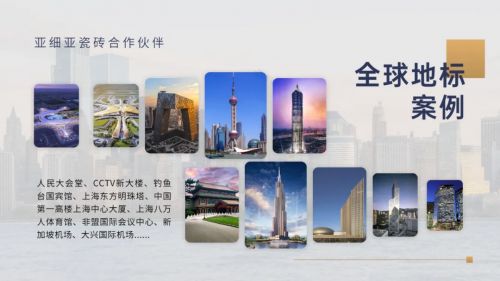 如今亚细亚瓷砖的销售网络遍布欧洲、美国、澳洲、新加坡、加拿大等49个国家和地区。以专业的产品和服务,先后成为人民大会堂、东方明珠塔、上海中心大厦、上海金茂大厦、世界第一高楼迪拜塔等全球著名地标项目的瓷砖供应商。