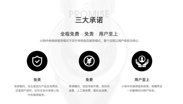 “中央维修”模式以中央仓为维修中心,以第三方快递为网络,实现待修产品从用户到维修中心送修、再二次快递至用户的售后服务流程。同时对用户做出三大承诺:服务过程中产生的双向物流费、维修费和零部件费均由小狗承担,保修期内人为损坏照样免费修、不区分责任,一切解释权归用户所有。