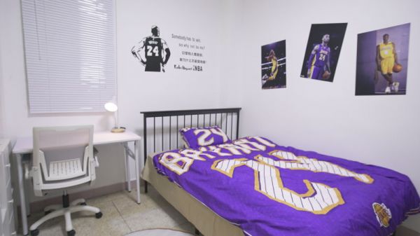 组装好书柜、安装好新的铁架床、放置些简易家具,摆上装饰书架及科比挂画,墙上安装上篮球框,再送上一件湖人队球衣和新篮球。