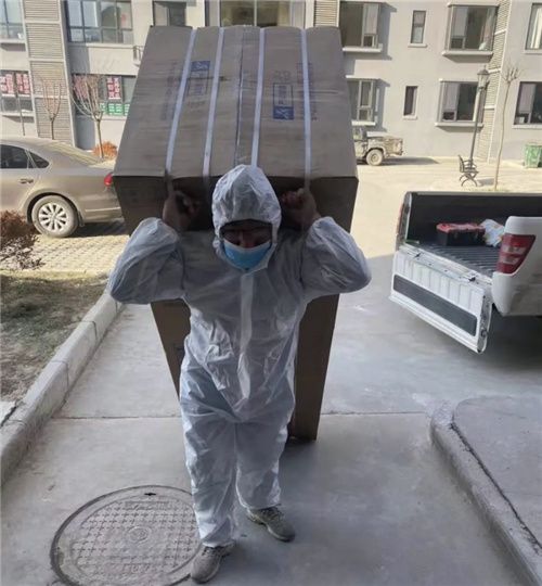 就这样,海尔服务人员冯师傅只身一个人来到了刘先生家楼下,但新的问题再次出现。由于刘先生家住六楼且单元没有配备电梯,冯师傅只能独自扛起冰箱从楼梯走上去,狭窄的楼道让他不得不铆足力气抬的更高一点。终于走到用户家门口时,身穿防护服累的浑身是汗的冯师傅,还是不忘进门前再进行一次全身消毒,并更换一次性手套、鞋套保障无接触服务。