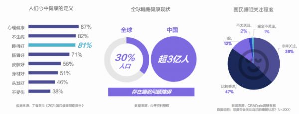 据床垫品牌梦百合联合第一财经发布的《国民睡眠健康趋势洞察》显示,81%国民认为睡得好是健康的定义之一,然而当代睡眠健康状况却不容乐观,全球约30%人口,中国超3亿人存在睡眠问题障碍,超过8成人表示会关注自己的睡眠状况。随着经济的发展,国民的睡眠时长却在减少,从2013年至今,国民平均减少了近2小时的睡眠时间;与此同时,我国睡眠经济蓬勃发展,整体市场规模在2020年超过4000亿,且将在2030年突破万亿。
