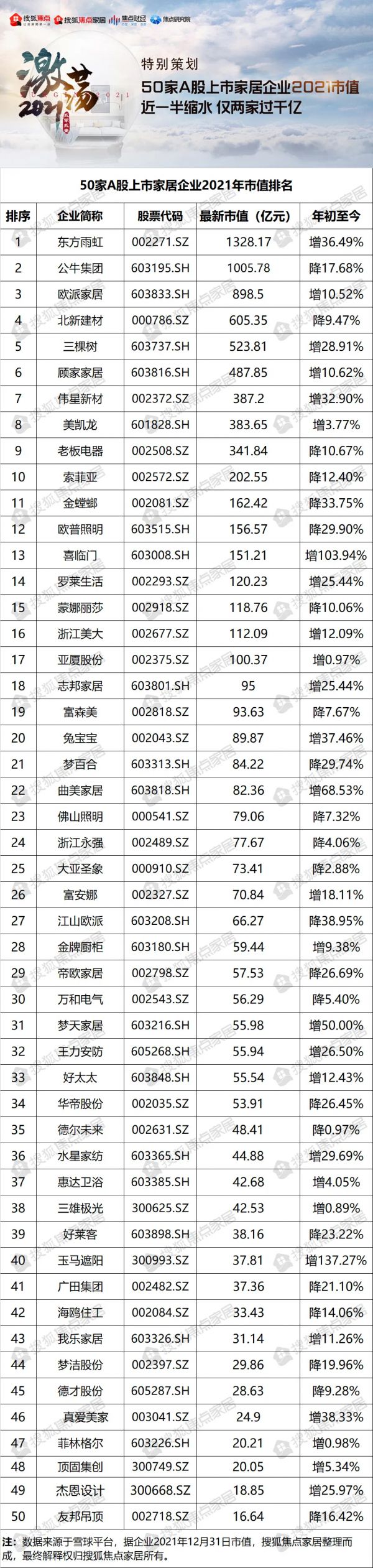 针对50家A股上市家居企业,据其2021年12月31日的市值表现,搜狐焦点家居特梳理出“50家A股上市家居企业2021年市值表现”排行榜。