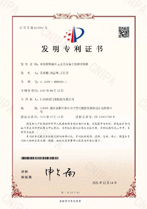 新浪门窗频道讯 近日,经中华人民共和国国家知识产权局审查,江山欧派申报的《重组材构成单元及其制备方法和重组材》发明获国家知识产权局颁发的专利证书。