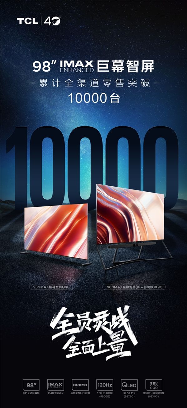在数据中我们可以看到,TCL以27.02%的销量占比强势登顶占比榜首,位列第一,远超国内外一众大牌!这也意味着,在98英寸这一新赛道中,TCL再次以领跑者姿态引领行业。而这还只是两个月前的数据,截至到12月,TCL 98英寸巨幕智屏累计全渠道零售已经突破了一万台,持续巩固着自己的统治地位。