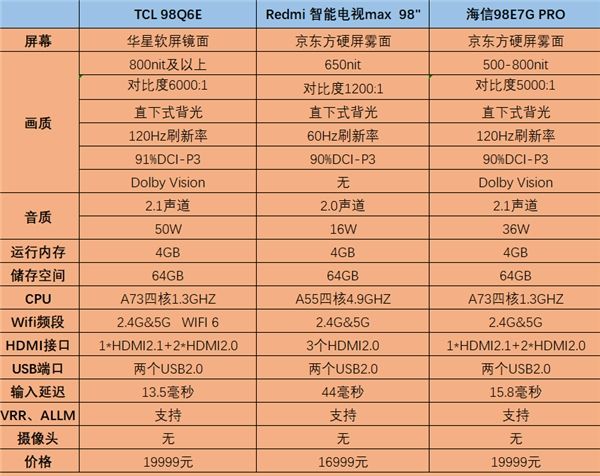 我们再来对比两万元以内其他品牌的98英寸智屏。从上表中我们可以看出,TCL 98Q6E IMAX Enhanced巨幕智屏参数配置完全碾压数年前发布的红米,而面对最近才上市的悉新品海信98E7G Pro来说,在屏幕素质、屏幕亮度、色域、音质、WIFI6、输入延迟等方面同样胜出。相较而言,海信更像是TCL的拙劣模仿者,推出的产品是激光电视销量走低后的无奈之举,有诚意不足之嫌。