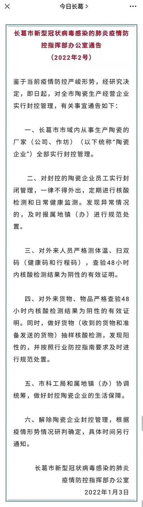 1月4日,长葛市疫情防控指挥部发布通告,鉴于当前疫情防控的严峻形势,经研究决定,即日起对全市陶瓷生产经营企业实行封控管理。