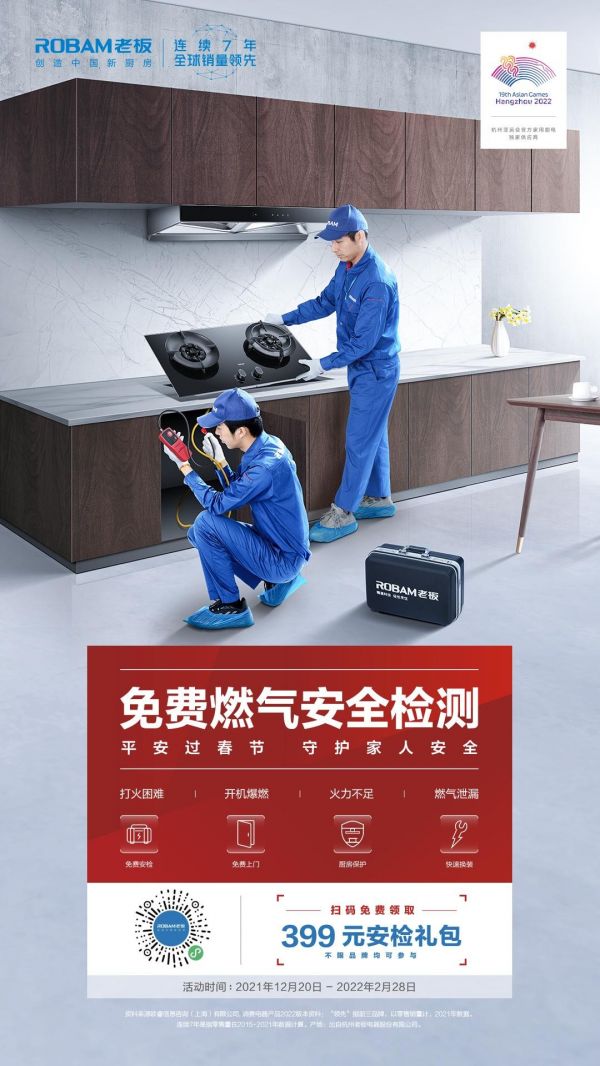 为了能让国人安心、放心度过新春佳节,老板电器在2021年12月20日-2022年2月28日期间,发起“免费燃气安全检测”活动。用户只需通过官网或官方小程序预约报名,就可以免费享受到价值399元的检测礼包,内含199元的安检服务和燃气灶200元无门槛抵用券。