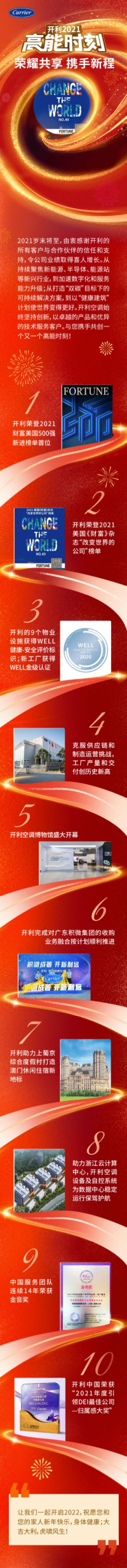 2021年,开利空调持续聚焦新能源、半导体、能源站等新兴行业,打造“双碳”目标下的可持续解决方案,其中值得关注的企业大事件有荣登财富美国500强新进榜单首位、9个物业设施获得WELL健康-安全评价标识、开利空调博物馆盛大开幕、完成收购广东积微集团等等。