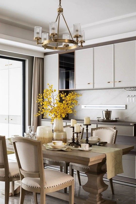 为了延续开阔空间的整体风格,设计师选择了与客厅硬木同系列的Maison餐厅搭配,内敛的浅橡色,经典的美式结构刀型,丰富的线条装饰点缀,形成悠然舒适风情在餐厅中的表达。