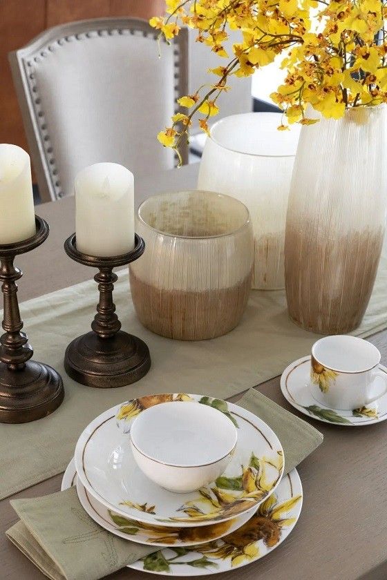 简单的桌旗点缀下,是热闹的复古烛台、柔美的花瓶和亮眼的餐具,有一种古典的优雅和实用的平衡。