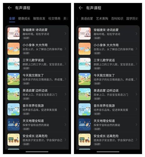 华为AI音箱2e的有声课程共分为七大主题,分别是健康成长、脑智启发、社交情商、英语 启蒙、国学历史、艺术熏陶、百科知识,并细分了32个子主题,将儿童内容根据此科学分类体系重新分组、打标签,方便用户快捷的找到所需内容。