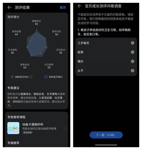 如果家长不知道如何给孩子安排学习计划,可以直接使用宝贝评测功能,只需输入孩子的年龄段,完成35道针对儿童的评测问卷,就可以快速发现孩子早教启蒙中的薄弱点,并针对性的推荐相应的学习课程,家长只需将推荐课程加入学习计划,孩子就可以跟着华为AI音箱2e进行学习了,可以说大大减轻了家长在孩子教育方面负担,同时大幅提升了孩子的学习效率。