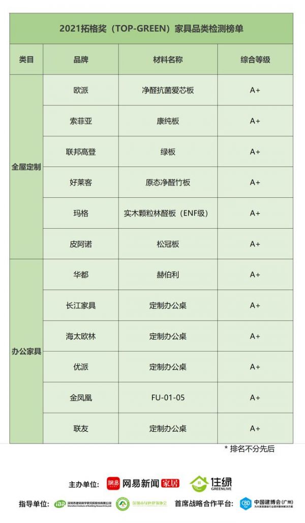 近日,由学术机构、检测机构、行业协会、权威媒体、绿色人居平台强强联合的2021拓格奖(TOPGREEN)公布了家具品类的测评榜单,此次实验室对165款家具类产品进行检测,其中有12款家具产品,均获得最高环保等级A+认证,环保性能值得肯定。