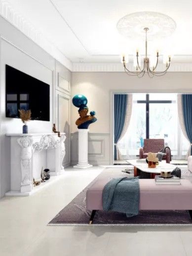 客厅的设计风格依旧是美式风格,设计运用经典的美式线条,设计理念简而不凡,在空间软装的搭配上,可以看到设计师的巧思,比如美式休闲沙发、宫廷风的吊灯,还有天花板上的石膏线条,都一一展示着美式风情。空间里的线条传达出了“秩序”,角落里的光束,在沙发的色彩及材质中,映射出一种未经雕琢的纯粹自然感。而在精致与有序的平衡中,雕塑的点缀则显得尤为出彩。