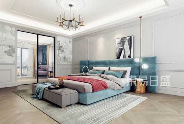 主卧区域,东易日盛设计师的色彩搭配延续了客厅空间大胆的撞色,以及墙面的装饰和餐厅区域相得益彰,床头柜的金属材质与楼梯间玄关处的理念融合统一。多元素的融合,表达了设计的主旨。而儿童房则提升了色彩的明度。采用经典的简美的搭配技巧,以白色的家具作为视觉的主导。利用粉色和蓝色的高饱和度颜色在软装上的点缀,提升了空间的活泼度。