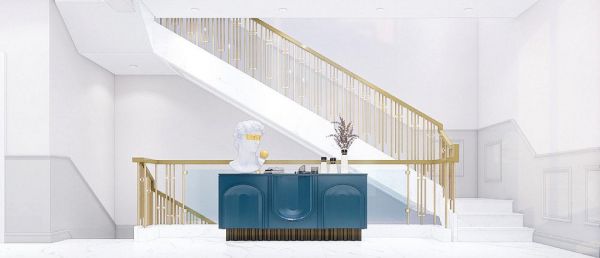 在楼梯间,金色的楼梯扶手,以轻奢的身份出现在空间中。为了平衡空间的关系,玄关柜则采用了具有艺术品味的造型,来展现空间低调中的奢华。再搭配一些复古的摆件,做旧的黄铜,以及复古的蓝调,让人拥有穿越时空的既视感。