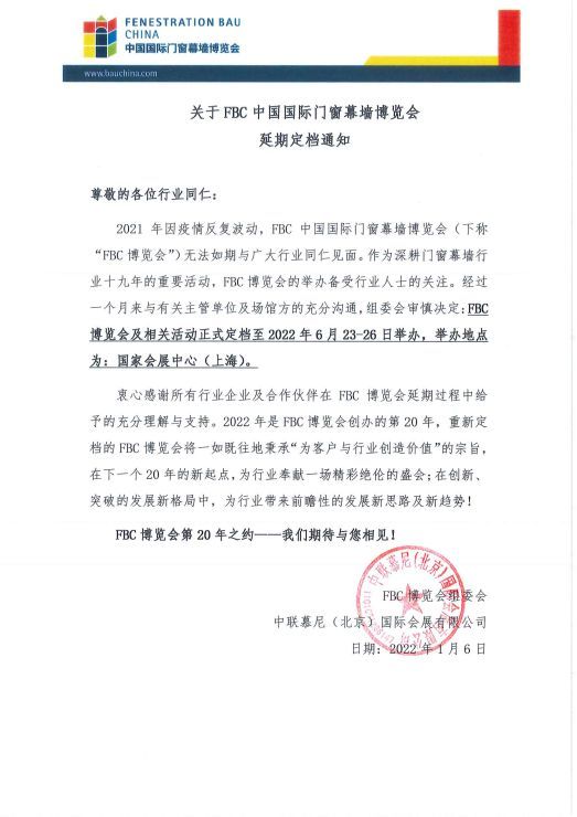 原定于2021年12月19-22日在上海·虹桥·国家会展中心举办的FBC中国国际门窗幕墙博览会及相关活动,正式定档至2022年6月23-26日,举办地点:国家会展中心(上海)1.2、2.2、7.2、8.2展厅。