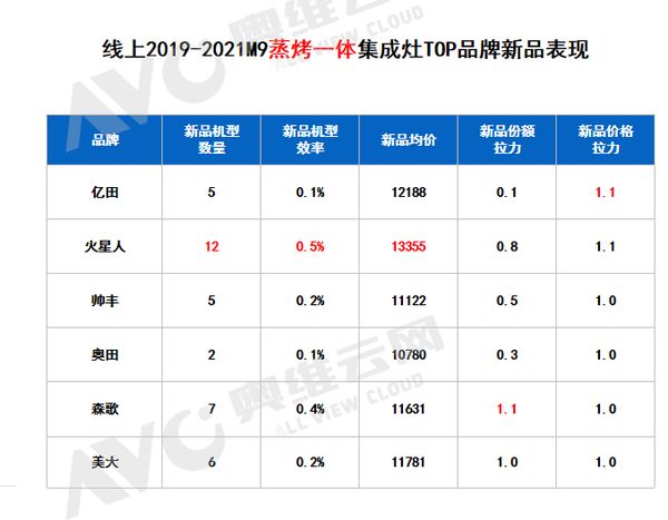 再看新品层面,对待新品,整个行业都采取了“机海战术”,在蒸烤类赛道布局较多。尤其是蒸烤一体品类,从线上来看,2019-2021M9,TOP品牌新品新品机型数量明显高于其他结构类型。