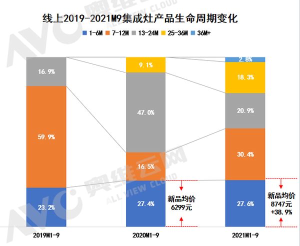 从奥维云网提供的产品生命周期变化数据来看,集成灶新品均价也有明显上涨。2021前三季度投放的新品,线上均价8747元,均价相比于2020同期增长了38.9%。这不仅表明集成灶品类进入了新品价格逐年走高的价格通道,也走进了新品高端化的价值通道。