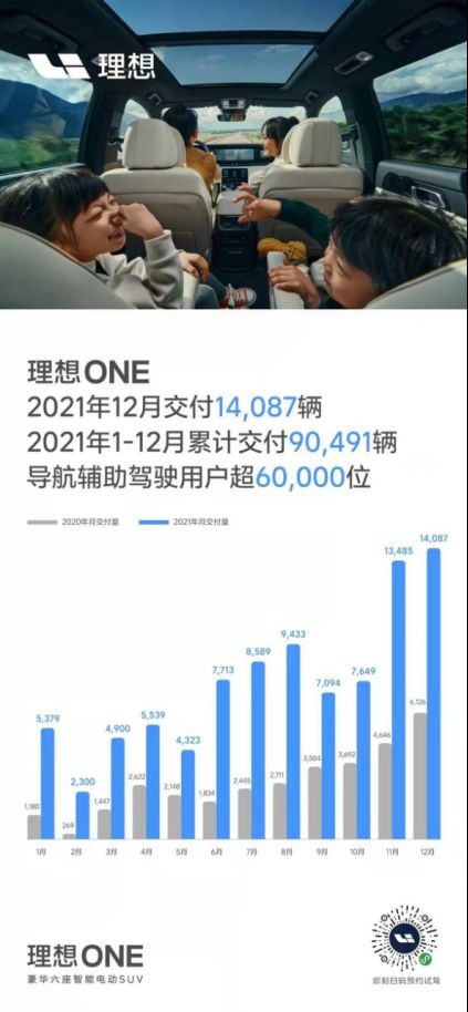 2022年1月1日,理想汽车公布了2021年12月及全年交付量。其中2021年12月,理想ONE交付量为14,087辆,同比2020年12月增长130.0%。2021年全年,理想ONE总体交付量 90,491辆,同比2020年增长177.4%。如此亮眼数据的背后,也说明了两个趋势:一是在国内大环境下,汽车市场正在发生结构性变化,市场从增量市场向存量或者换购市场切换、车型从传统燃油车到新能源车转变,用户需求更加细分化和个性化;二是随着国家二胎、三胎政策的推出,家庭用户在选车时更倾向于座位更多、空间更大、更实用的车,满足一家人对生活品质的追求、对家庭生活的全新体验。