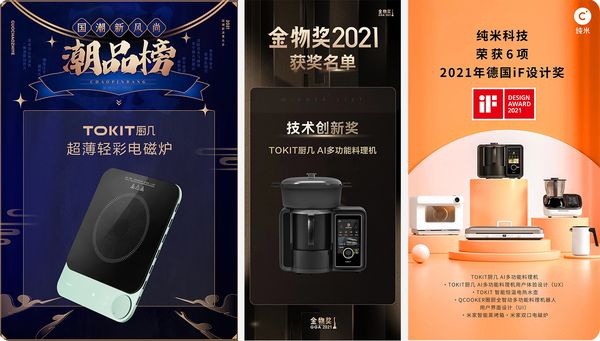 产品上的不断创新使纯米2021年收获了众多奖项,极大拓升了品牌的专业度和知名度。年初6项德国iF设计奖,定调了这一年的开拓创新之路。之后,TOKIT厨几,AI多功能料理机接连斩获2021中国设计智造大奖(DIA)、吴晓波频道金物奖;TOKIT厨几超薄轻彩电磁炉刚上市就荣登《2021国潮新风尚·潮品榜》;更有圈厨品牌喜获2021年德国红点奖·品牌与传达设计奖。