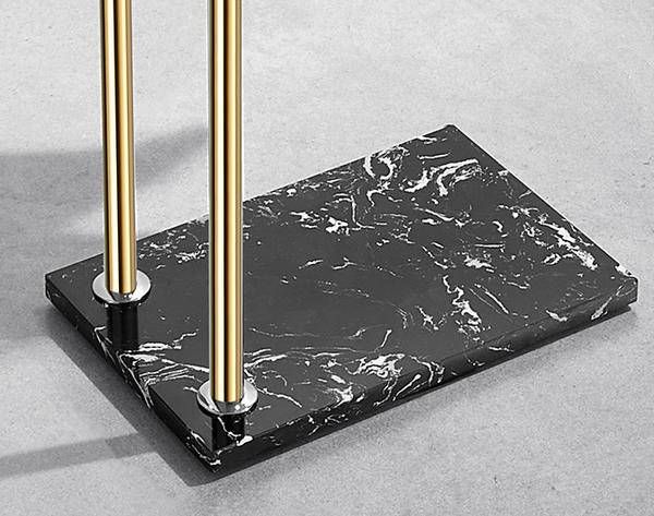 卡贝落地毛巾架采用大理石基底和黄铜支架组合而成。每一块石头都有自己独特的纹理,黄铜支架闪耀着电镀金属光泽,与大理石的自然纹路交相呼应,黑金配色,展现出主人不一般的品味。