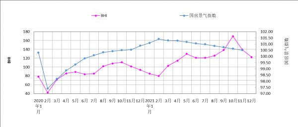 图1:2020年1月-2021年12月BHI与国房景气指数对比图