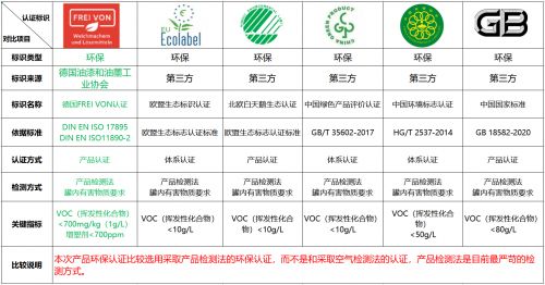 在国际主流的环保标识中,德国FREI VON环保标识是满足德国涂料行业标准中的无溶剂、无增塑剂的健康指标,符合德国VdL-01的相关申明导则。通过市面上采用产品检测法测试涂料环保性能的6个主流环保标识对比图中,不难发现德国 FREI VON环保标准(VOC<1g/L)是其中VOC要求最为严格的环保标识。