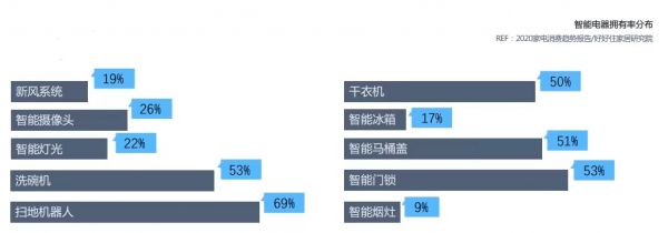 好好住家居研究院在《2020家电消费趋势报告》中一项针对“智能电器拥有率分布”的调研显示,受访者家中拥有率最高的智能电器是扫地机器人,占比为69%,并列第二的是洗碗机和智能门锁,占比为53%,之后排名顺延的智能电器分别是智能马桶盖、干衣机、智能摄像头、智能灯光、新风系统、智能冰箱和智能烟灶。不难看出,智能小家电在受访者家中的普及率明显高于智能大家电,小家电可以局部提升使用便利性,但缺少大家电的配合,还是难以实现全屋的高效智能联动。