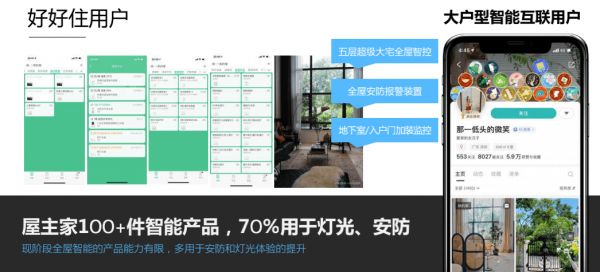 好好住app内的“智能大户”,昵称为“那一低头的微笑”的住友家在深圳,前些年她用市区两套小面积住房置换了一套五层半的联排别墅,无论从安全出发还是便捷考虑,选择「全屋智能」都是一件省心省力的重要决定。如今她家中有100多件智能产品,其中70%的产品功能集中指向于灯光和安防,分布全屋用于提升服务和体验的智能产品不足30%。在好好住app内与“那一低头的微笑”相似的住友不在少数,他们热衷于尝试新锐的智能家居产品,但因为或认知或服务的限制,致使全屋的智能化程度并不健全。