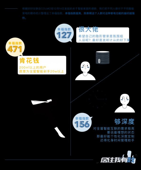 好好住新媒体团队通过在线上发起调研,了解更多中国家庭的智能化生活现状,也与1698位朋友一起展开了一场针对未来智能家居的沉浸式幻想,总结发现了独居青年、恋爱人群、宝妈、大宅屋主们对于全屋智能的不同期待,这些期待并非是不着边际的幻想,更多是对如今智能产品问题的思考。
