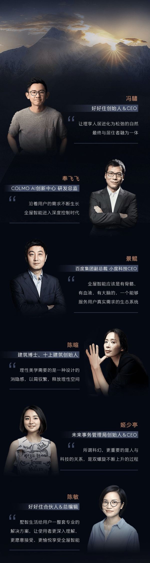 发现问题后该如何面对与解决,便有了文章开头时提到的雪山之行。好好住联合COLMO在梅里雪山邀请了6位在家居圈、设计圈、科技圈、文化圈颇具影响力的行业专家,一起围绕“未来居住全屋墅智生活”促膝夜谈。专家们探讨得出的专业服务+全维生态+深度智能+墅宅美学+因需进化直面用户的6大痛点,也共同组成了能够提供给企业和用户的一套“未来理享家”的解决方案。