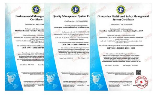 截至目前,深圳昆仑家具已先后通过一众国际质量管理标准体系认证,且在推进过程中,先后获得深圳、全国以及国际上的各项荣誉奖项认证,并获得相应机构颁发证书。