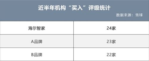 进入2022年,海尔智家接连获得多家券商机构的关注,仅1月11日至今已有13份研报给予“买入”评级。另据雪球数据显示,海尔智家近半年获得27家券商机构发布研报推荐,其中有24家给予“买入”评级,为行业最多。