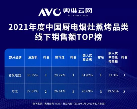 统计来看,在油烟机、燃气灶、消毒柜、洗碗机、嵌入式复合机、嵌入式单功能电蒸箱、嵌入式单功能电烤箱7个厨电大品类的线下份额中,老板电器2021年一共拿了4个第一,3个第二,而老对手方太拿了1个第一,3个第二,3个第三,可见厨电市场品牌集中度聚拢的趋势已日趋明显。