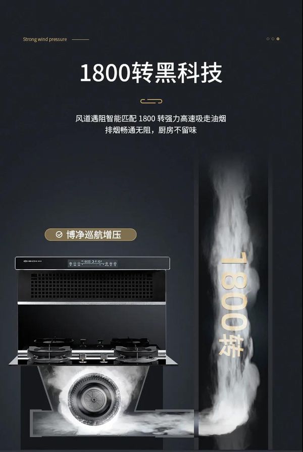 博净分体式集成灶拥有智能变频电机在工作时会自动巡航增压,遇烟道阻力智能调速,1800转黑科技强劲动力,产生瞬时大吸力,确保油烟不倒灌。