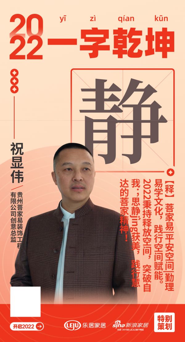 在“2022一字乾坤”活动中, 贵州菩家易装饰工程有限公司创意总监祝显伟用「静」表达了2022年的规划和目标: