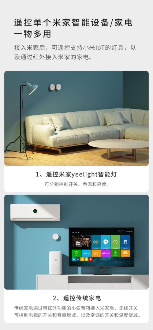 采用蓝牙5.2协议,通过具有蓝牙网关功能的设备接入米家后,遥控接入米家的智能灯具及家电。随心调节家里智能灯具的开灭、亮度及色度;控制传统家电如电视机的开关和音量增减,空调的开关和温度增减。