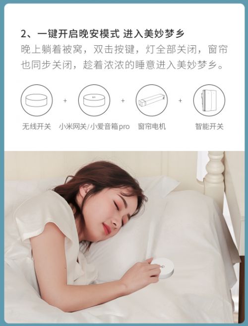 一键进入晚安模式:晚上躺在被窝里双击按键,联动卧室的智能开关及窗帘电机,灯全部关闭,窗帘也同步合起;