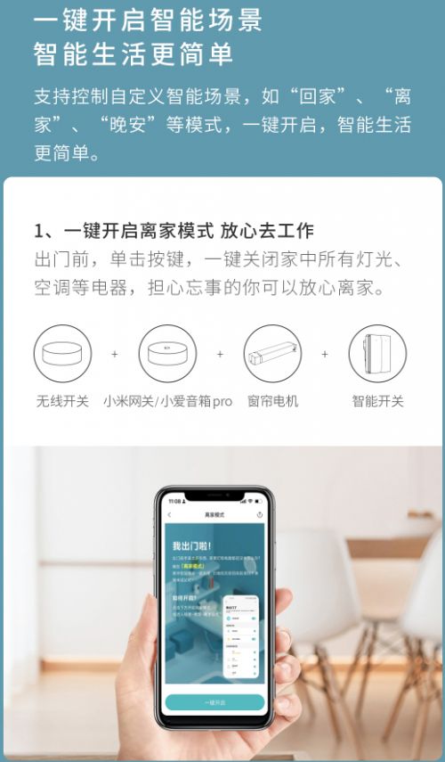 一键执行离家场景:出门工作前单击按键,联动家里的智能开关、家用电器,即可关闭所有灯光、空调等设备;