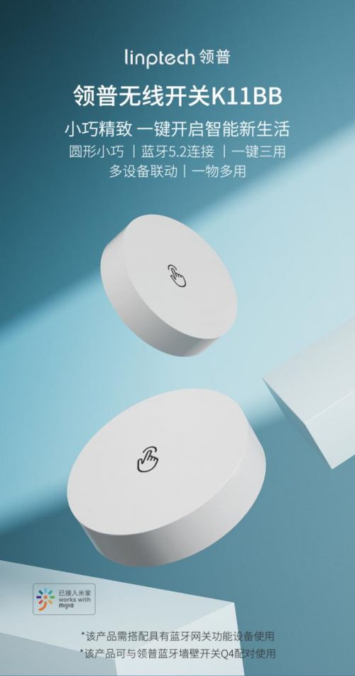近日,领普全新蓝牙无线开关全面开售,这款新品无需额外购买网关,可直连带有蓝牙网关功能的小爱音箱,接入米家后遥控多个智能设备或智能场景。