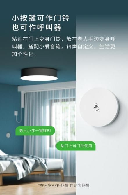 可将蓝牙无线开关粘贴在门上或老人房床头位置,直接与带有蓝牙网关功能的小爱音箱配对使用,在场景中自定义按键呼叫铃声,无线开关即刻变身门铃/呼叫器。小小的身材,每时每刻的贴心守护。