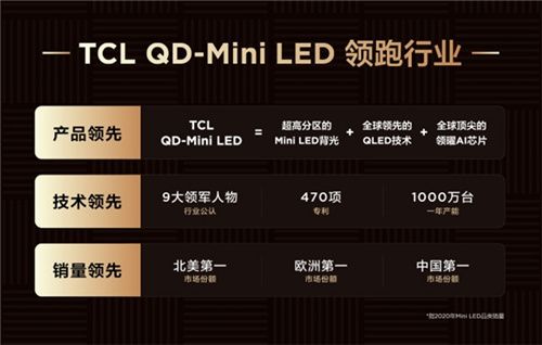 而在一众拥抱Mini LED的大厂中,TCL却显得与众不同。相比起依赖供应商,掌握着华星光电的TCL显然实力更高一个段位。作为最早布局Mini LED的企业,TCL在电视行业还在进行QLED、OLED显示技术方向之争时,便已开始启动Mini LED技术预研,并于2018年在IFA上展出全球首台Mini LED背光电视,在2019年推出全球首款量产Mini LED电视。2020年更是拿下全球Mini LED电视产品90%的份额。