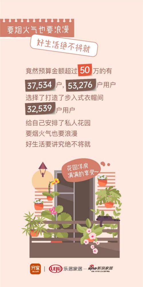 数据显示,新生代的家装用户以女性为主,占到了总比例的58.3%,这也说明在家装家居等大宗消费决策上女性用户喜好起着主导作用,这体现在实用性功能区的布局上,有53,276户用户选择了打造了步入式衣帽间,同样更多的用户愿意将家装修的浪漫一点,《报告》显示,有32,539户用户给自己安排了私人花园,甚至有人装修过180平米的阳台。