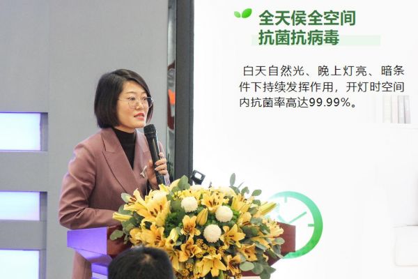 随后,浙江理工大学教授王騊围绕硅钛复合光触媒新材料的特点及应用展开介绍。王騊教授指出,通过灯光等可见光激发的光触媒新材料与照明灯具的融合,是天然的优秀抗菌抗病毒防护设备,佛山照明在疫情当下,积极推出光触媒抗菌抗病毒健康照明灯具,将带给照明行业和用户一种全新的空间净化价值创新和生活体验。