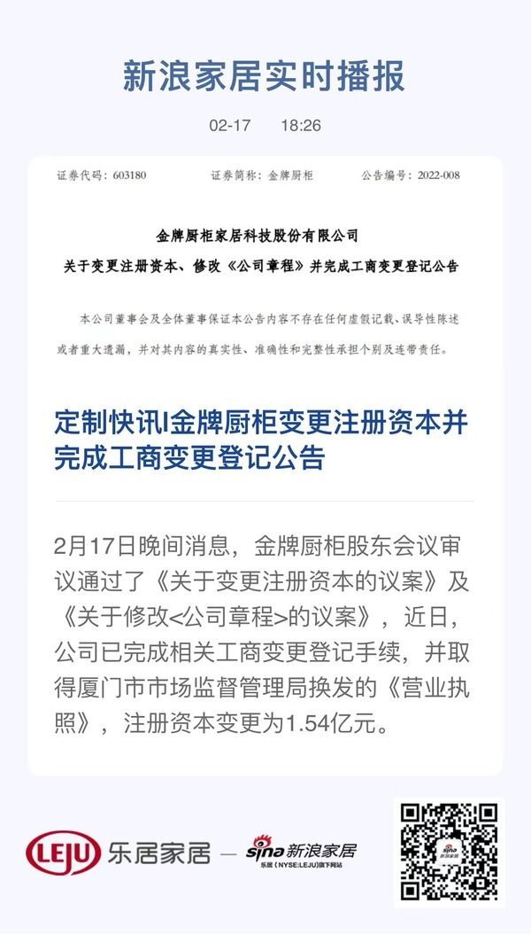 定制快讯|金牌厨柜变更注册资本并完成工商变更登记公告