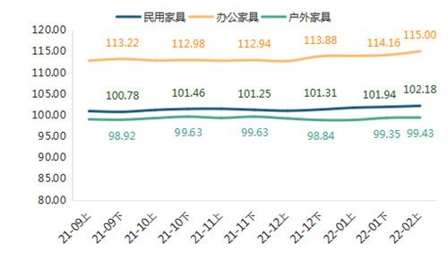 春节过后办公装修、企业转型等均需要定制、采购办公家具,办公家具处于流动市场,也是较为兴旺的时期。从指数监测结果来看,2月上半月办公家具价格指数涨势为首,收报115.00点,环比上涨0.84个点,达到近半年以来的峰值。相较办公家具而言,户外家具、民用家具价格指数涨势相较温和,且与实木家具指数一致,均表现为4期连涨,2月上半月分别收报99.43点和102.18点,环比分别上涨0.08、0.24个点,总体仍处于相对稳定状态。