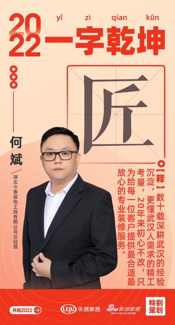 “乐业安居”是中国人最为共情之处,湖北家居人深谙汉字对于国人、对于企业的非凡意义,武汉新浪家居战略合作伙伴、家居行业优秀代表:湖北今泰装饰工程有限公司总经理何斌,以「匠」字打开新年仪式感。