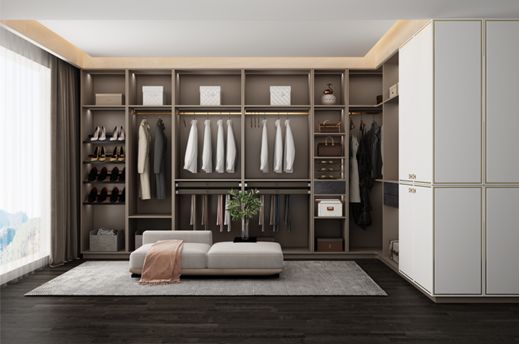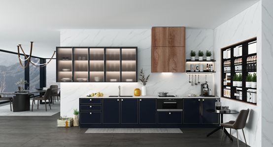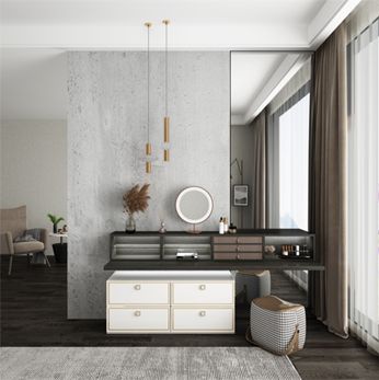 低调、奢华、有内涵,曾经网络上博人一乐的“凡尔赛”用语背后,反映出真正的轻奢一族对生活方式的现代化塑造。柏厨未央,用设计重塑东方美学的细节。整套产品采用了PET和吸塑两种材质,整个空间充满了活力和灵动感。门板的搭配设计有星光蓝、凝脂白和绅士灰三种,给空间环境提供了更多的质感和温度。经典边型门板造型中间嵌铜条,经典边型的设计使嵌铜条部分与板面平齐,提高了视觉上的美感,从视觉上完美规避铜条与门板连接处产生缝隙。并且嵌铜条部分的拉槽带有角度,铜条与铜条之间通过自制转角件连接,有效提升了空间格调,更美观耐用。铜条透露着低调的奢华之感,强烈突出了未央轻奢简约风。此外,古典中式的梳妆台设计,圆镜犹如皓月当空,垂吊而落的灯桶似银烛秋光,让人在长夜未央时更懂得简单,宁静,平衡的意义。
